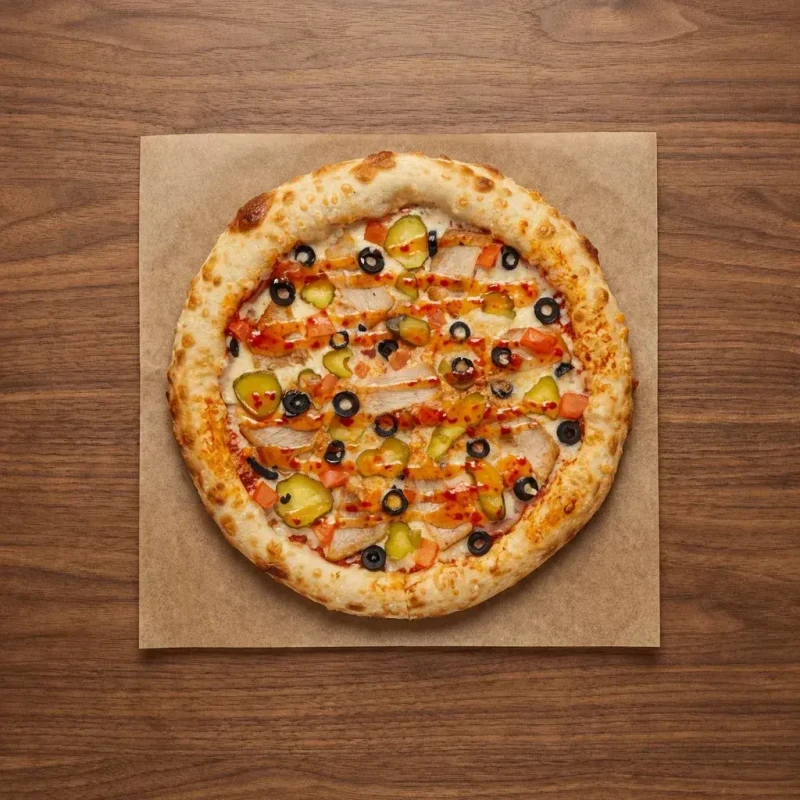 Томатный соус, ветчина, моцарелла, буженина, соленые огурчики, оливки, помидоры, кисло-сладкий соус Ø 32см. ~ 650г.